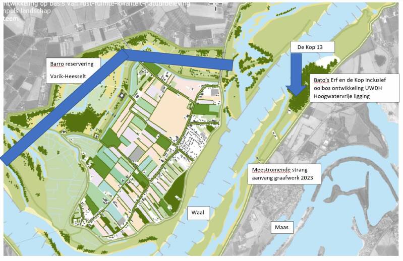 Ons huis ligt in het rivierbed van de Waal, 400 en 1700 meter van de voor Nederland zo belangrijke rivierdijken af. Het ligt op, en met de koelkelders in een oude zomerkade. Met een kwartiertje lopen zitten we aan de Maas, dichter bij elkaar komen deze twee rivieren nergens. De Kop ligt op het hoogwatervrij gelegen 8,5 ha grote natuurgebied Bato's erf van Staatsbosbeheer. De hoge ligging dankt de Kop ( van: "zandkop") aan de zandafzetting van toen de Maas en de Waal elkaar hier nog wel raakten. Bato's erf was in de vorige eeuw een steenfabriek en na renovatie door StaatsBosBeheer SBB het lokale bos. Het uiterwaard gebied wordt onder Natura 2000 planning de komende jaren aangepast met een meestromende strang en het bos van Bato's erf wordt rond onze woning uitgebreid met een hardhout ooibos van eiken, iepen en wilde kers. Aan de overzijde van de Waal is een Barro reservering voor de regionaal veelbesproken hoogwatergeul Varik-Heesselt. Deze moet bij extreem hoogwater de stroomopwaartse dorpen en steden als Tiel en Nijmegen 40-55 cm waterverlaging bieden. Voorlopig is de geul van de baan, maar voor als er een waterverlagingsingreep moet worden gedaan is de planologische reservering gemaakt en in de plannen opgenomen van het Nationaal Water Plan NWP. Bang zijn voor een rivierverbreding hoeven we niet want de Kader Richtlijn Wateren KRW is te lezen dat het (verder) verwijderen van dammen, dijken en kribben ter plaatse van onze woning tot stremming voor scheepsvaart zou leiden door verzanding van de dan langzamer stromende rivier. Dit verklaart dan ook waarom er zo vaak een peilboot voor de deur heen en weer vaart. We liggen weliswaar ver af van de primaire waterkering af, maar daarvan kunnen we ook al stellen dat het Waterschap Rivierenland het rekenwerk heeft laten doen door ing. bureau Actaris en dat de eventuele dijkverhoging voor de komende 50 jaar al is vastgelegd in de legger (de tekeningen) van de Heerewaardense Afsluitdijk.