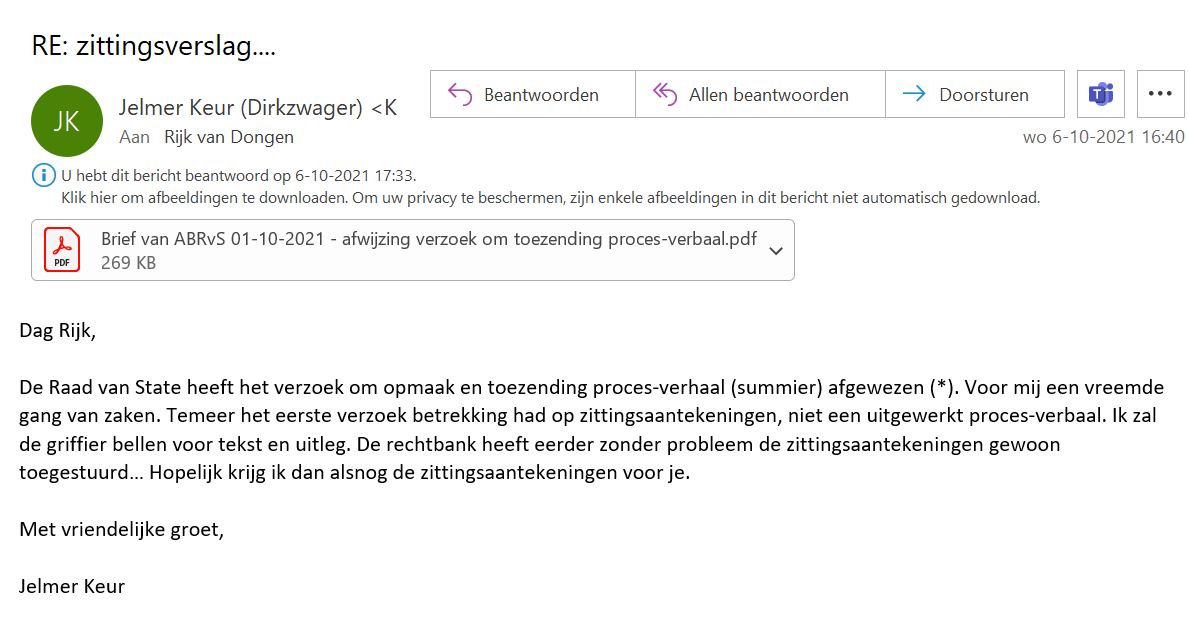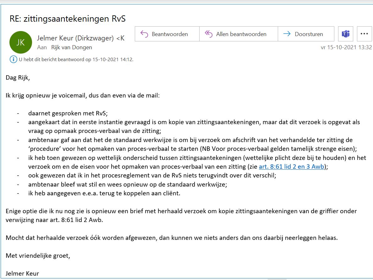 De notities van de zitting hadden we graag toegevoegd aan het dossier zodat iedereen onze opmerkingen over de RWS leugens kan verifiëren, mocht iemand daar nog aan twijfelen. En het feit dat RvS zijn eigen inleiding willens en wetens negeert in de uitspraak. We hebben de zittingsaantekening bij de ABRvS aangevraagd en kregen de vraag retour of we deze uitgewerkt wilden hebben als een proces verbaal. We vragen er niet om want het is veel extra werk, maar prima dan. Dan moeten we wel ons verzoek om een proces-verbaal beargumenteren wat we doen, en daarna wordt ons verzoek afgewezen. Dan moet onze advocaat de Raad van State nota bene uitleggen dat ze met hun procedure de wet niet volgen en wat het wettelijke onderscheid is tussen zittingsaantekening en een proces verbaal, en op ons eerste belletje reageert de raad van State met "maar we doen het altijd zo". Ja, maar dat maakt het niet legitiem of correct.