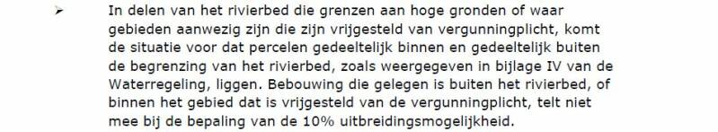 Leest u punt 6 hierboven: "Langs---liggen Het uitgangspunt is dat bebouwing in-------------------of buiten het rivierbed niet meetelt voor het berekenen van de 10%. Er ------------------gebied Uitbreidingen moeten namelijk zoveel mogelijk buiten het rivierbed plaatsvinden.