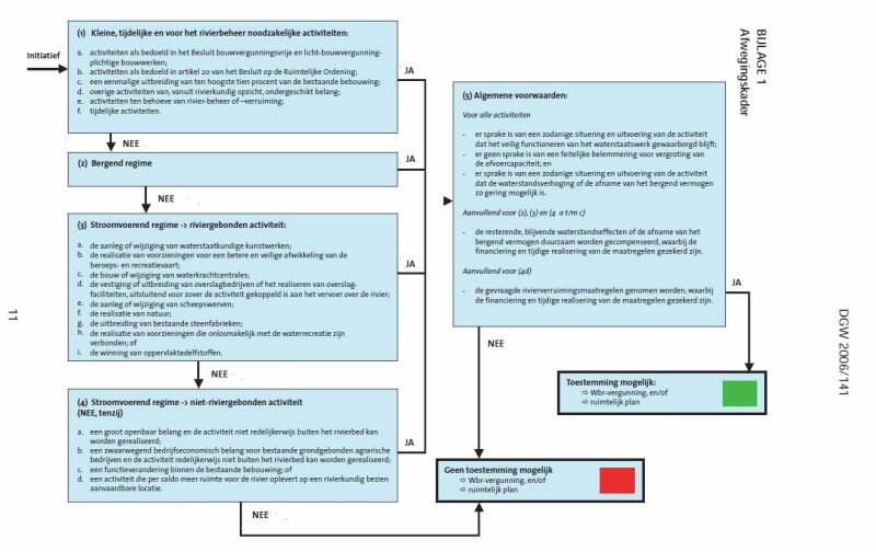 Accoord van RWS en het Waterschap vallen samen in één watervergunningsaanvraag, waarbij RWS het hoogst bevoegde gezag is in het rivierbed. De door RWS gesuggereerde meest efficiënte procedure was een vooroverleg, waarna het ingediende plan snel kon worden vergund. De beoordeling van, en werkwijze met de verschillende rivierwater gerelateerde wetten is vastgelegd in de Beleidslijn Grote Rivieren, de BGR. Een beleidslijn is feitelijk het werkboekje voor de ambtenaar, maar is geen wetgeving, en de BGR moet de correcte uitvoering van de rivier gerelateerde wetgeving realiseren. Leest u zelf in deze link de 4 componenten waaruit de BGR is gemaakt. Eens in de zoveel jaar wordt er een aangepaste BGR versie gepubliceerd zoals o.a. in 2002, 2006, 2014 en 2019. Ook is er in 2016 een evaluatie gedaan over het functioneren en draagvlak van de BGR.