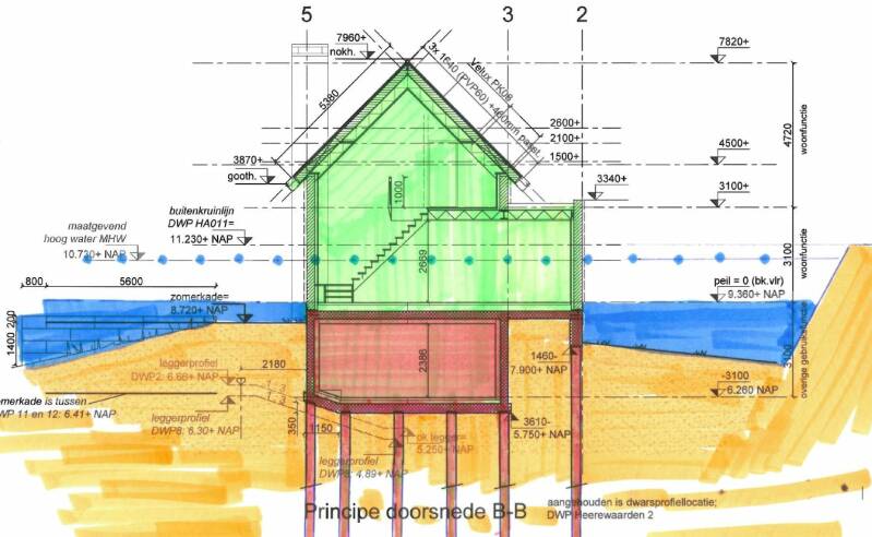 RWS neemt zelfs de moeite de woning op onze funderingsschets van de hoogwatervrije fundering schetsmatig uit te werken.
