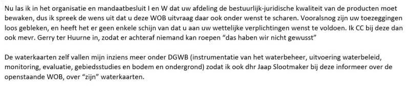 Uit onze WOB 10% documenten blijkt dat ook RWS al heel lang op de hoogte was van het ontbreken van enige detaillering op de kaarten en dat men vanwege alle klachten en problemen keihard aan het werk was de kaarten kwalitatief te verbeteren middels een interne inventarisatie en navraag bij de gemeenten, in samenwerking met DGWB, die primair verantwoordelijk is voor de kwaliteit van de kaarten. (Directoraat Generaal Water en Bodem)