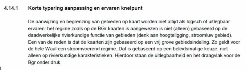 Uit de evaluatie van de BGR had ik al een voorbehoud gelezen (4.14.1 onderstaand) over de kwaliteit van de de kaarten, waar in de evaluatie ook interne RWS rapporten worden aangehaald over de incorrecte kaarten en de frustraties die daar uit volgden. De zeer grove gebiedsindeling (te veel werk? bestuurskundig niet relevant?, geen data voorhanden? strategische opzet van RWS DGWB?) heeft dan wel als gevolg dat er mensen (ik ben de enige niet) kapot gemaakt worden, relaties potentieel duurzaam ontwricht door de stress en woede die mensen langzaam maar zeker misvormt, en dat het geld voor de oude dag opgaat aan procederen tegen RWS die je met plezier en zonder gene kapot maakt. Ik heb me feitelijk niet tijdig gerealiseerd wat 4.14.1 impliceerde. Tenslotte was dit pas mijn eerste aanvraag voor een watervergunning toch, en ooit had ik toch nog vertrouwen in ambtenaren en rechters? Maar de uitkomst voor nu is: we krijgen geen vrijstelling meer omdat RWS prutskaarten in elkaar flanst zonder enige landschappelijke kenmerken en die RWS daarna als beoordelingsdocument gebruikt om terechte hoogwatervrije locaties onterecht af te wijzen, en onterecht nog onbebouwde locaties er aan toevoegt voor vrijstellingen voor toekomstige projectontwikkelaars in gebieden die over een paar decennia permanent blank staan. Het is dus gekende kennis bij RWS, en hun afwijzing op grond van de kaarten behorende bij de BGR is een grove onzorgvuldigheid.
