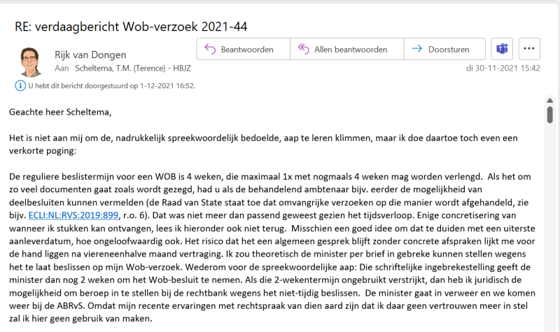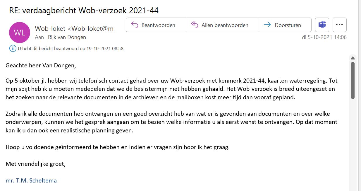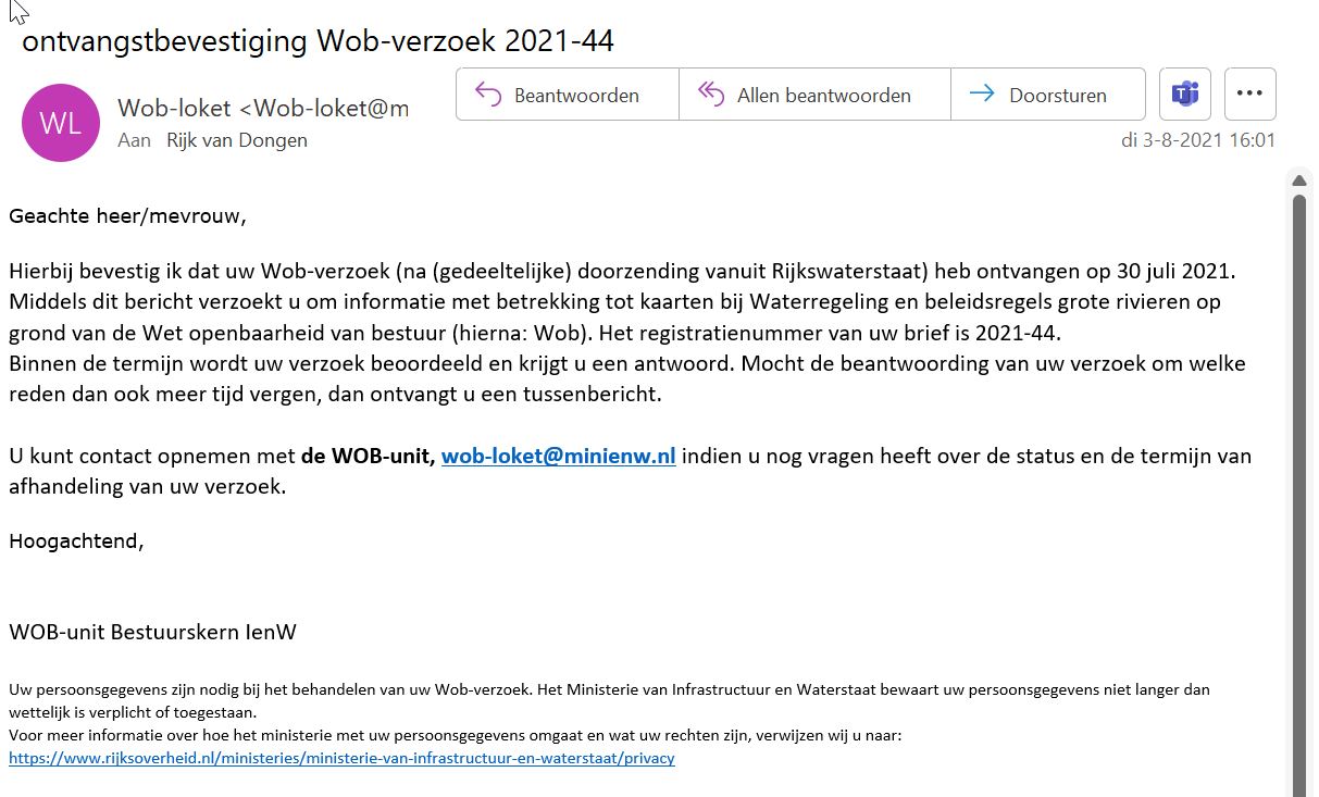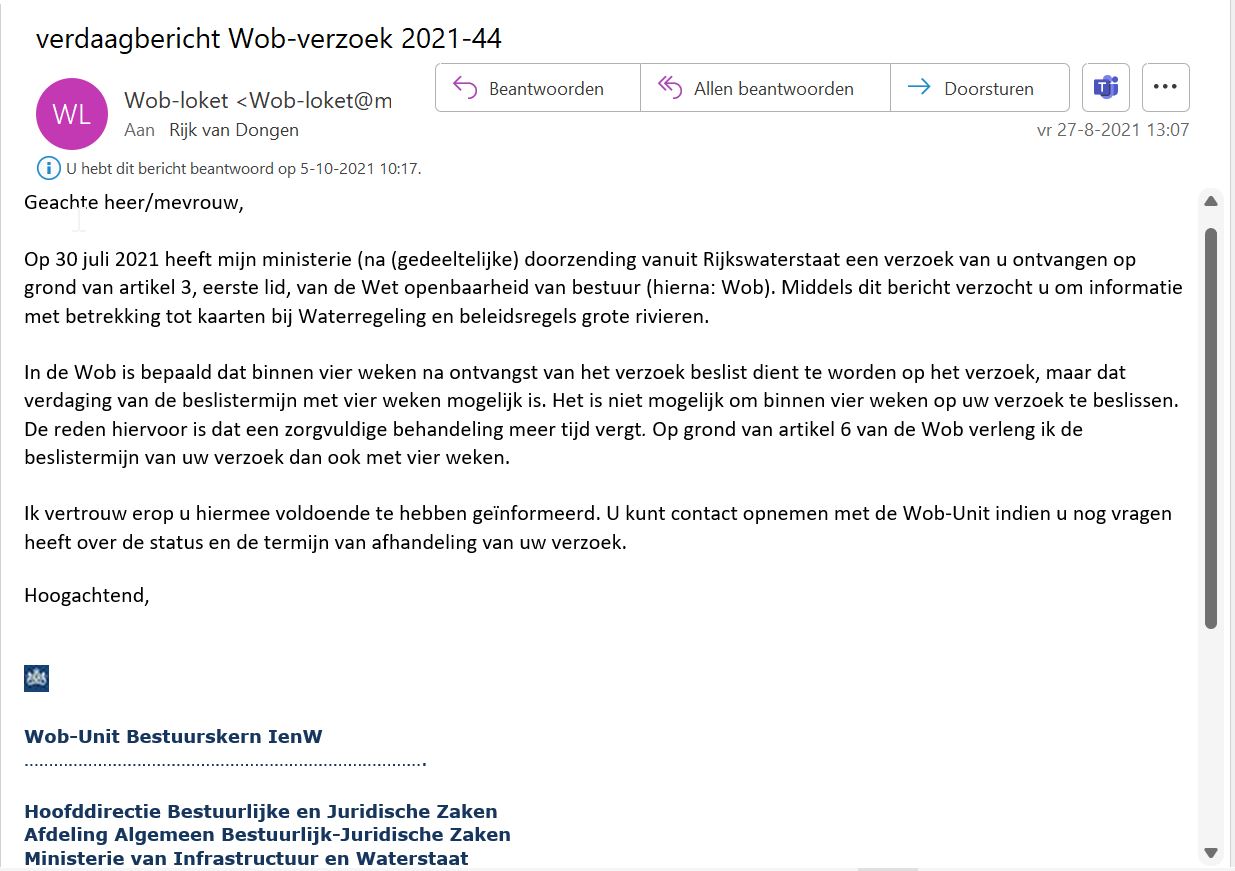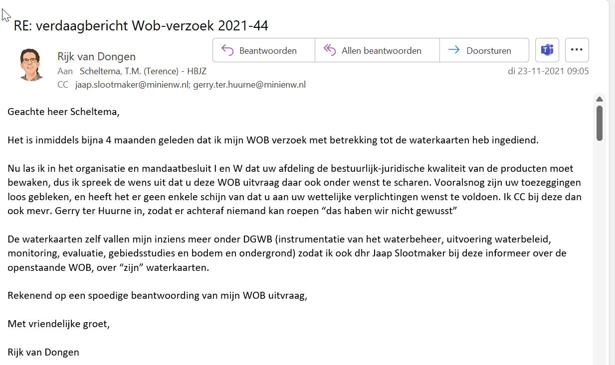De vierde WOB die we in werking hebben gezet gaat over de erbarmelijke kwaliteit van de waterkaarten, die niet overeenkomen met de rivierkundige en landschappelijke realiteit, en zelfs niet onderling met elkaar: Jammerlijk prutswerk dus. Standaard na 4 weken de termijnverlenging ontvangen. Maar wat er gebeurt, er komt maar geen toezending. Aanmaning, na aanmaning, na aanmaning levert ons excuses, en smoesjes, en leugens op: maar geen antwoord. Gelukkig hebben we een zolder om de smoesjes op te ruimen maar vanaf juni 2021, en na een paar keer telefonisch contact staan we nog steeds op slopershoogte. De schijn wordt gewekt met "we zijn hard aan het werk voor u", maar ik weet inmiddels hoe de olifantenpaatjes lopen op het Ministerie, en al meerdere malen ben ik aantoonbaar tegengewerkt, voorgelogen en halve WOB' s ontvangen. Maar laten we voor nu het DGWB alle voordeel van de twijfel geven. Alleen met volharding en creativiteit krijg je soms informatie boven water bij onze overheid. En mijn woede helpt vol te houden. Maar de verantwoordelijke van de kaarten is helemaal niet met de WOB bezig. Na vier maanden koppel ik terug aan het Departement van Vergetelheid, gezeten in Askaban (is een grapje, komt uit Harry Potter), waterdrager van dienst: